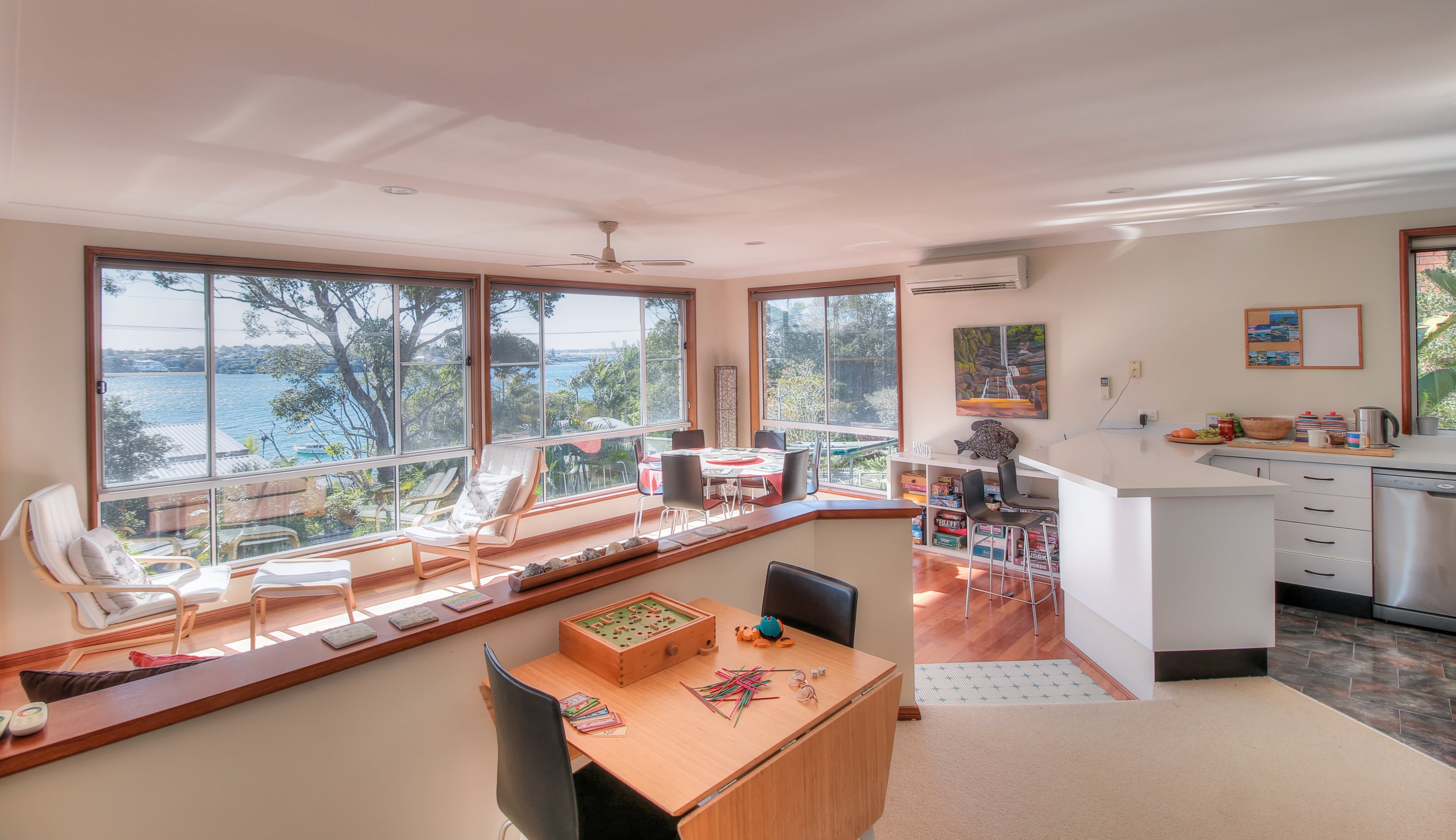 The Solveena home is a 3 bedroom, 2 bathroom family holiday house overlooking the sea. The rooms are spacious, and the living areas are open plan with 180 degree water views, giving the space a wide, sunlit, sprawling feel. This is the only holiday rental providing the full family holiday experience with four living areas and all the entertainment you could possibly want: Netflix, DVDs, music, over 30 board games, table tennis, dartboard, three kayaks and fishing equipment. Fully furnished and equipped with all linen and towels, the only thing you need to worry about here is whether to go swimming, kayaking or for a hike along the coast. The most tranquil beach in Bundeena (Gunyah) is only a two minute stroll, and the other main beaches (Jibbon/Hordern) are an easy five minute walk.